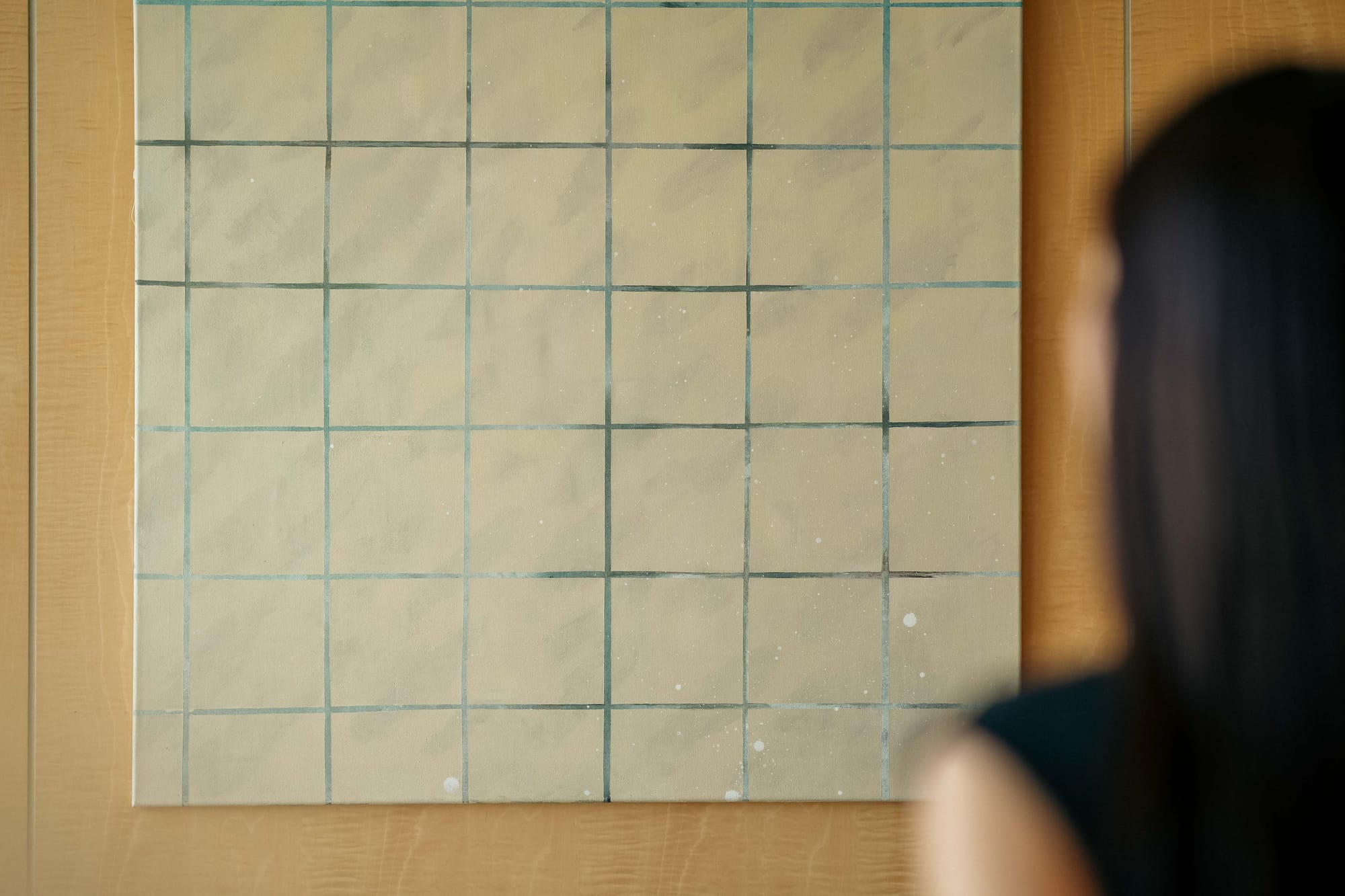 The exhibition presents five selected paintings from her contemplative body of work. Moons and night skies drift into scenes anchored by quiet domestic details — curtains, interiors, familiar textures. The effect is subtle but deliberate: expansive yet intimate, surreal yet grounded.