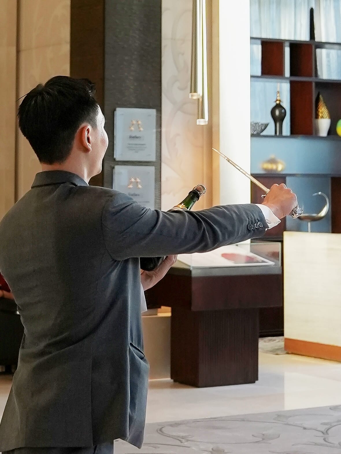 At The St. Regis Bangkok, sabrage is not a party trick — it’s a ritual. Inspired by the Napoleonic tradition of opening bottles with a saber to mark moments of triumph and transition, the daily Champagne Sabering ceremony signals the graceful shift from day into evening. Performed with ceremony and precision in the lobby at 6:00 PM, the moment transforms Champagne into theatre, anchoring heritage, romance, and just enough drama into a single, clean strike. Guests don’t just drink Champagne; they witness it.